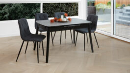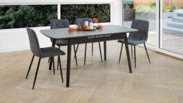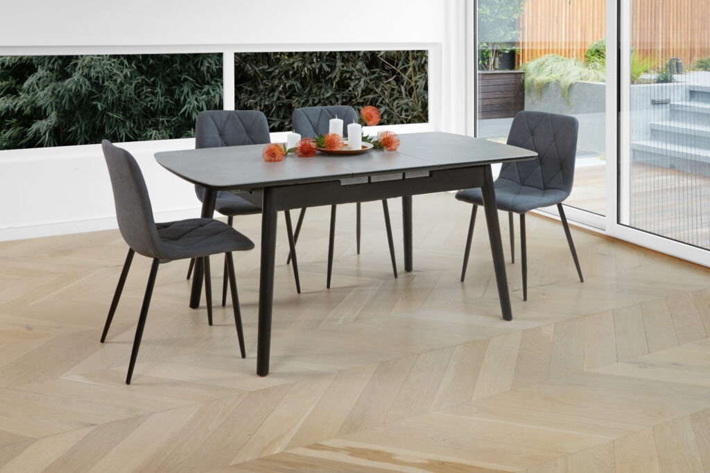 Table extends from 1200 to 1600 in Greystone and Snow White finish. Galaxy Dining Chairs available in Charcoal and Grey